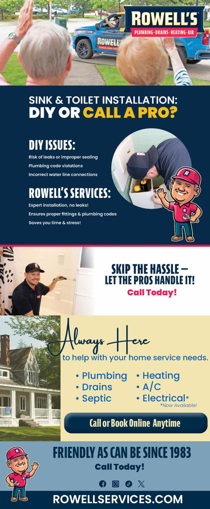"Friendly As Can Be Since 1983!" When you need help with your plumbing, drains, heating, cooling or electrical in Somersworth, you can always rely on Rowell's Services! Call us now or book online!